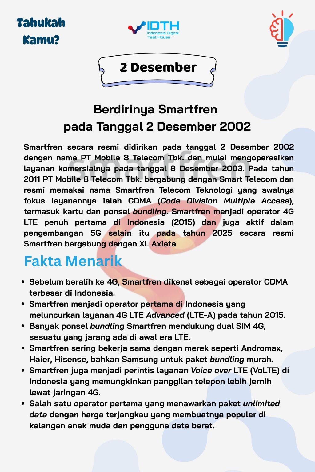 Secara resmi Smartfren didirikan pada tanggal 2 Desember 2002 dengan nama PT Mobile 8 Telecom Tbk.