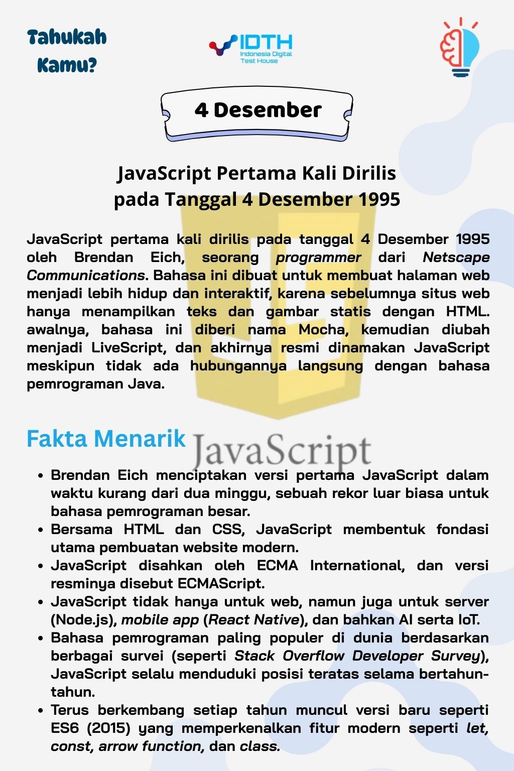 Javascript pertama kali dirilis pada tanggal 4 Desember 1995 oleh Brendan Eich, seorang programmer d...