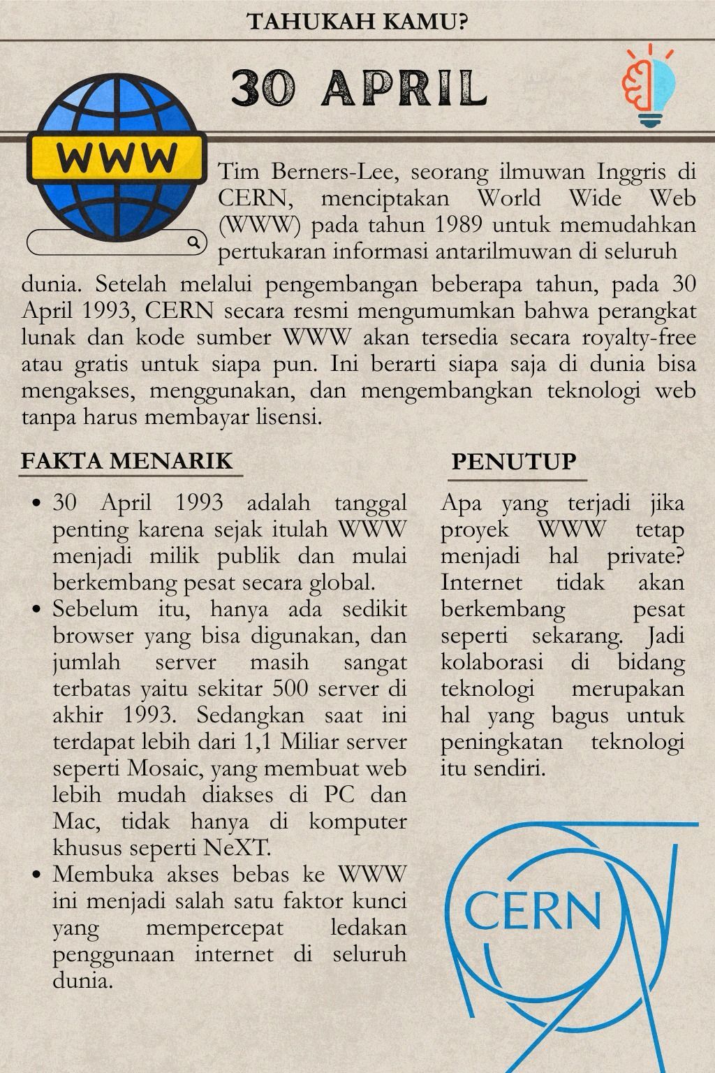 Tim Berners-Lee, seorang ilmuwan Inggris di CERN, menciptakan World Wide Web (WWW) pada tahun 1989 u...