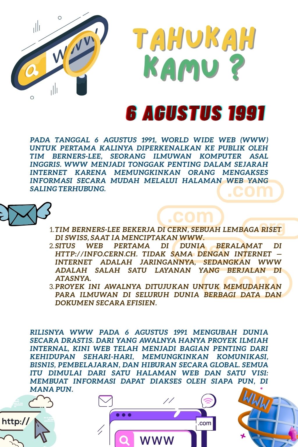 Pada tanggal 6 Agustus 1991 WWW (World Wide Web) untuk pertama kalinya diperkenalkan ke publik oleh...